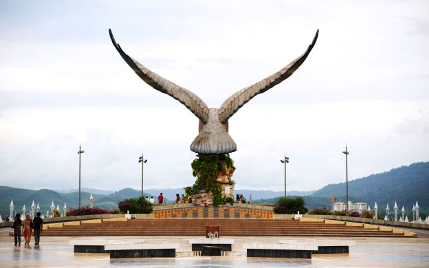 Eagle Square es el punto de referencia más prominente de Langkawi. Situado cerca del embarcadero de Kuah, es una magnífica estatua de un águila marrón rojiza majestuosamente preparada para volar. Otras atracciones incluyen Black Sand Beach, Kota Mahsuri y Batik Factory, donde se puede ver batik tradicional y moderno en la fabricación.